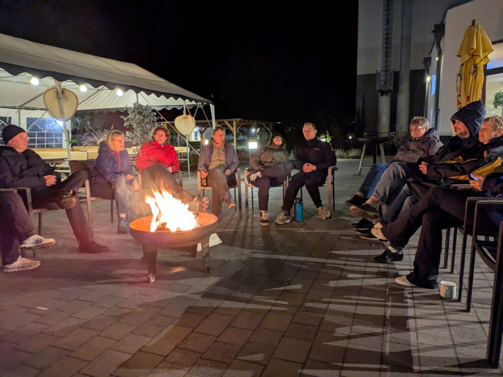 das Licht ausgemacht wurde. Hier endete der Abend nicht: Warm angezogen setzten wir uns an die Feuerschale im Hof und ließen den Abend vor den bunt flackernden Flammen ausklingen.